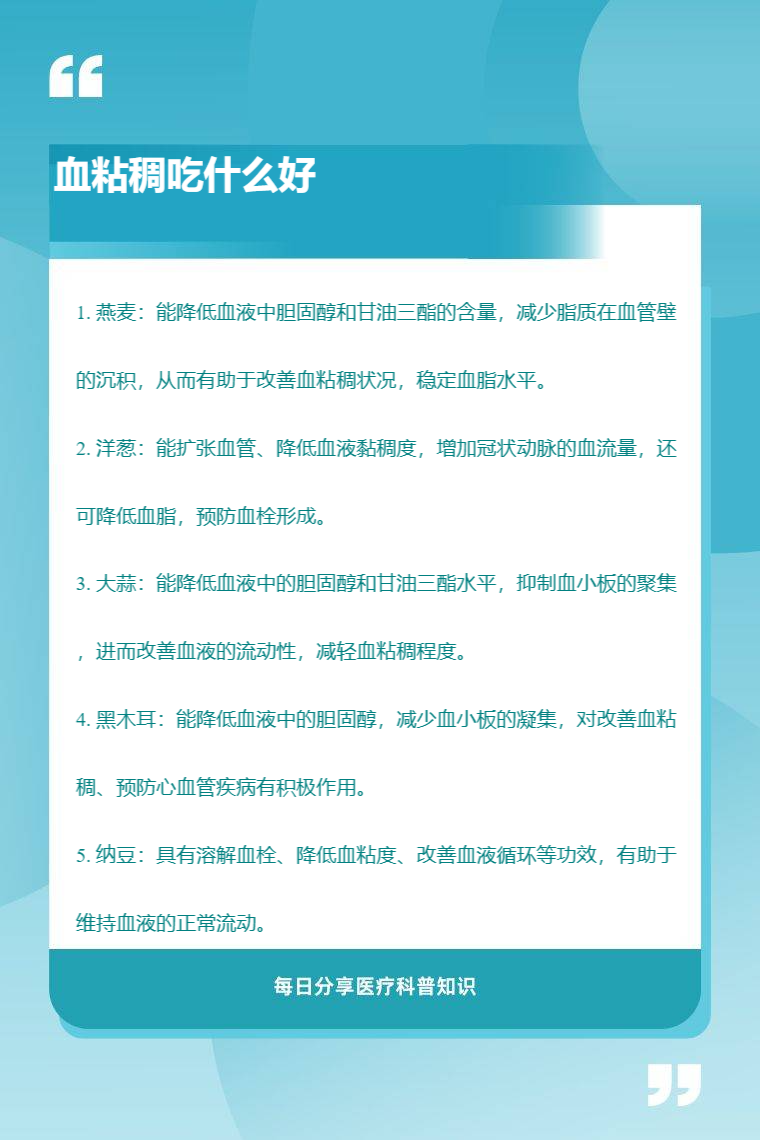血粘稠可通过食用燕麦、洋葱、大蒜、黑木耳、纳豆等进行调理。