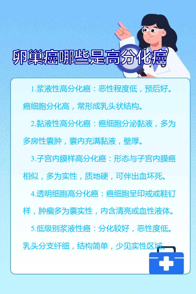 浆液性高分化癌、黏液性高分化癌、子宫内膜样高分化癌、透明细胞高分化癌、低级别浆液性癌等高分化癌在卵巢癌中较为常见。