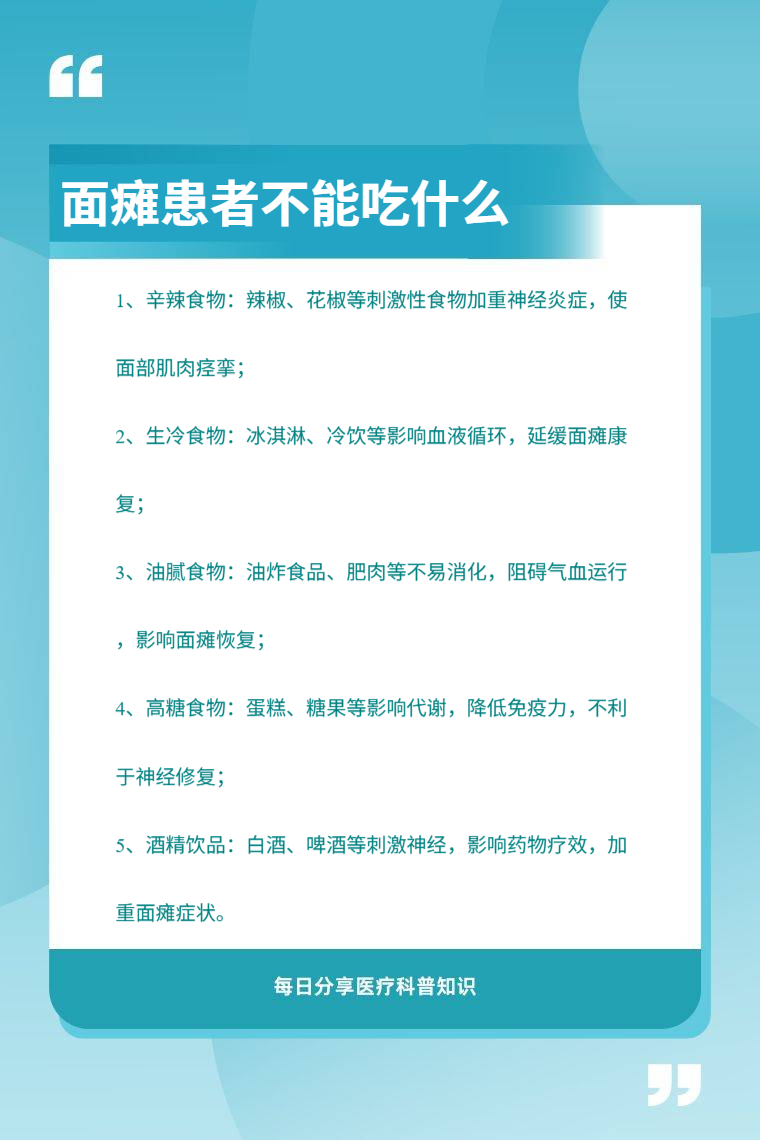 面瘫患者不能吃辛辣食物、生冷食物、油腻食物、高糖食物、酒精饮品等。