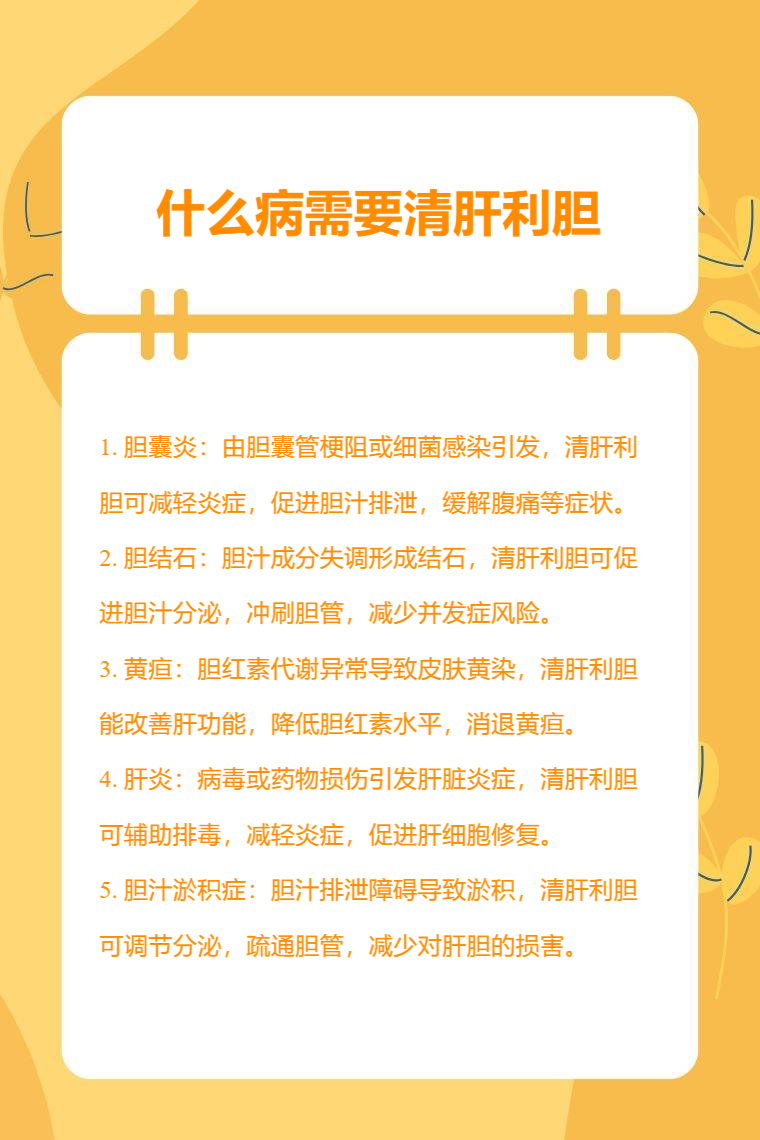 胆囊炎、胆结石、黄疸、肝炎、胆汁淤积症等疾病需要清肝利胆。