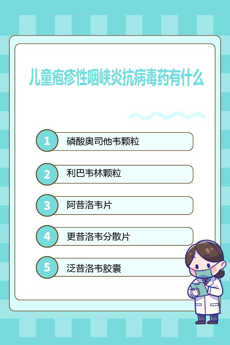 儿童疱疹性咽峡炎常用的口服抗病毒药有磷酸奥司他韦颗粒、利巴韦林颗粒、阿昔洛韦片、更昔洛韦分散片、泛昔洛韦胶囊等,具体用药需严格遵医嘱使用。