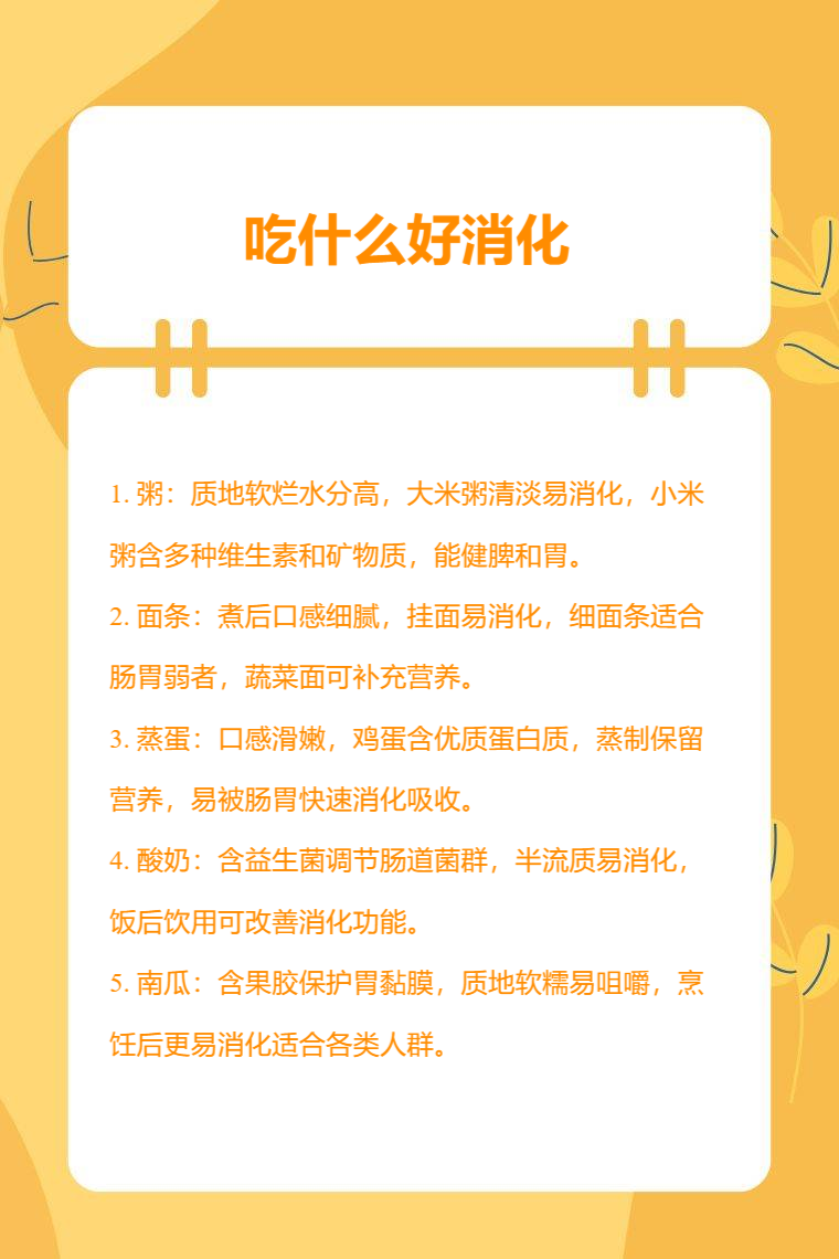 粥、面条、蒸蛋、酸奶、南瓜等都是好消化的食物。
