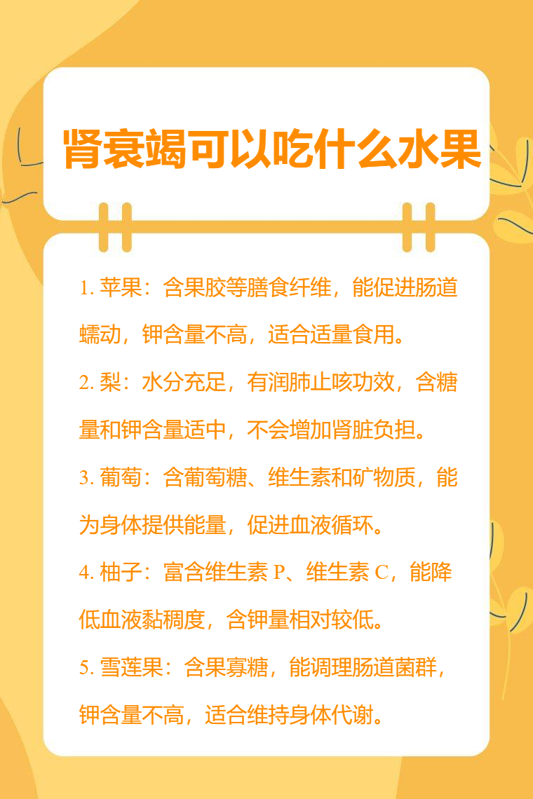 肾衰竭患者可吃的水果有苹果、梨、葡萄、柚子、雪莲果等。