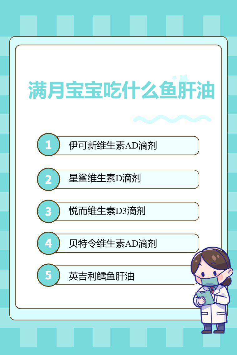 满月宝宝可选择的鱼肝油有伊可新维生素AD滴剂、星鲨维生素D滴剂、悦而维生素D3滴剂、贝特令维生素AD滴剂、英吉利鳕鱼肝油等。