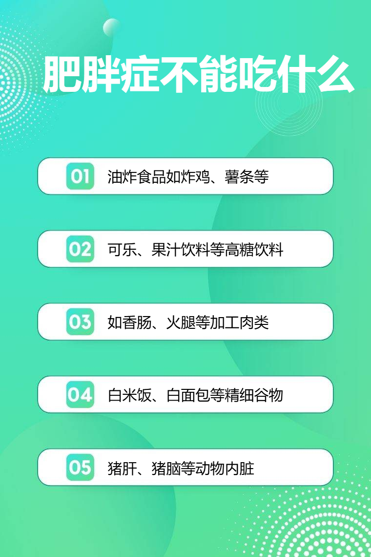 肥胖症不能吃油炸食品、高糖饮料、加工肉类、精细谷物、动物内脏等。
