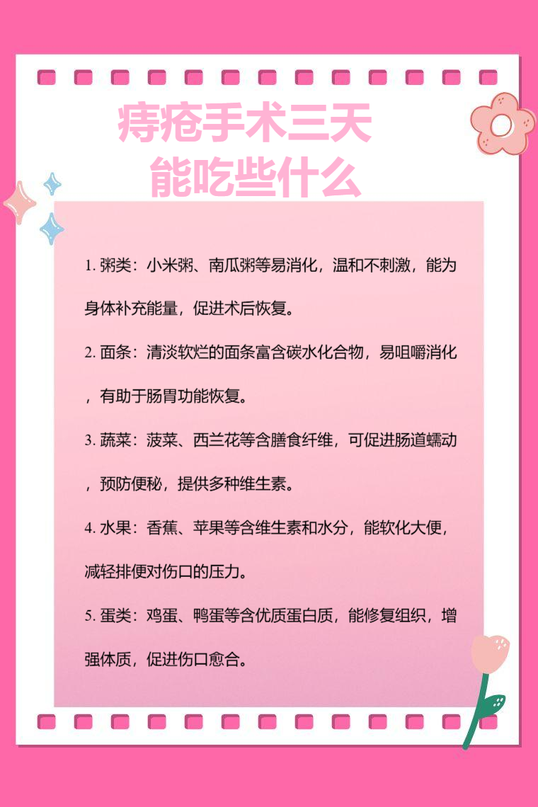 痔疮手术三天后可吃的食物有粥类、面条、蔬菜、水果、蛋类等。