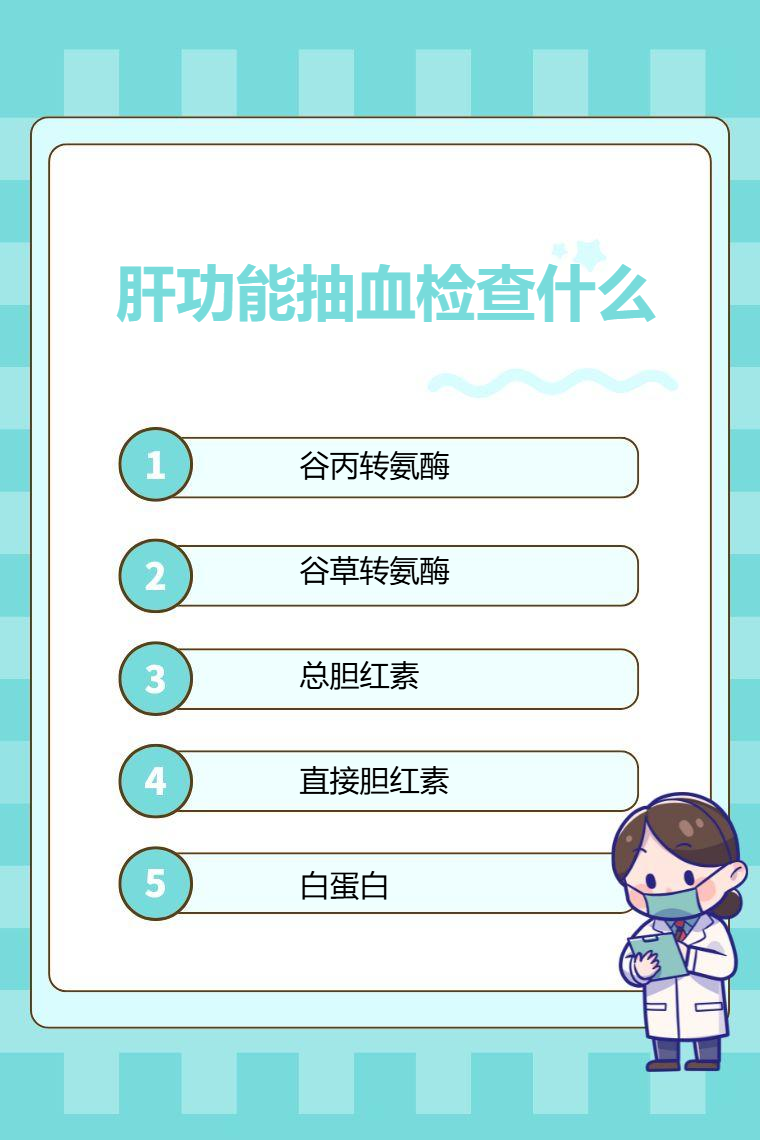 肝功能抽血检查项目包括谷丙转氨酶、谷草转氨酶、总胆红素、直接胆红素、白蛋白等。