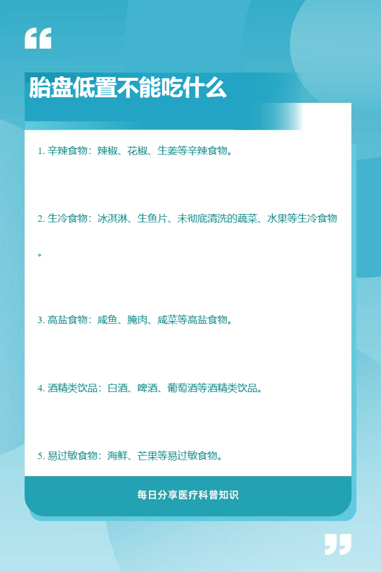 胎盘低置不能吃辛辣食物、生冷食物、高盐食物、酒精类饮品、易过敏食物等。