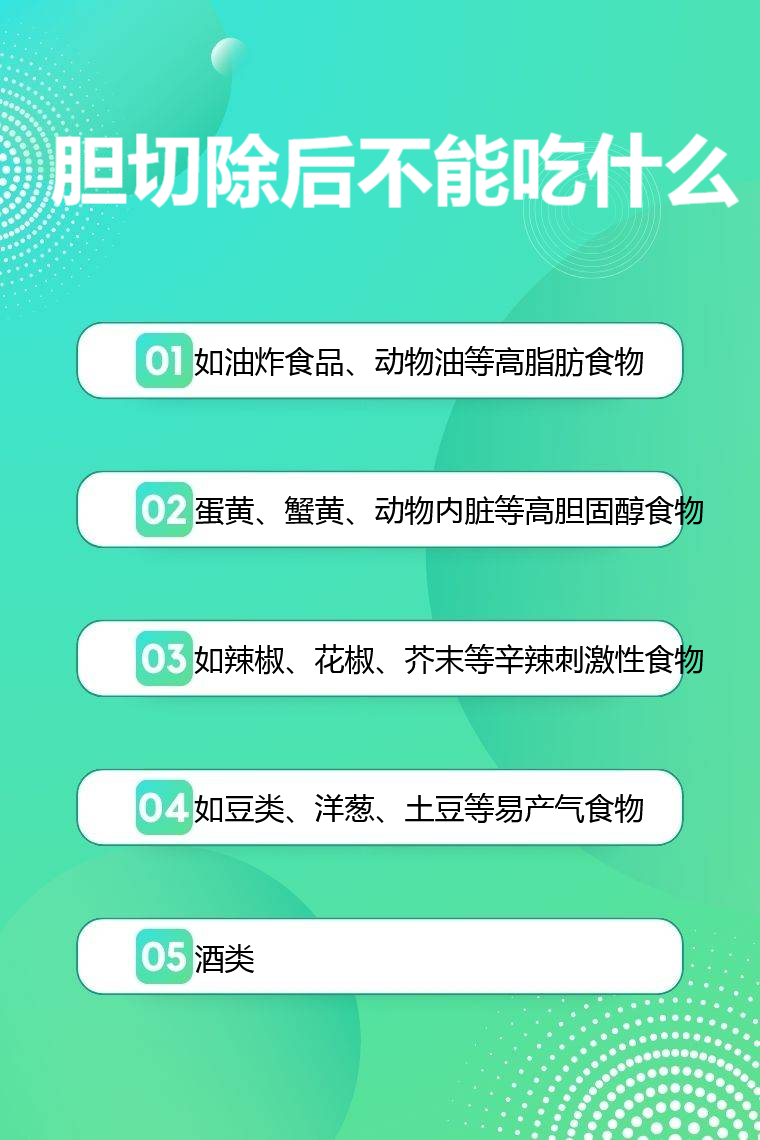 1.高脂肪食物:如油炸食品、动物油等。胆囊切除后,胆汁无法像之前那样规律储存和释放,高脂肪食物会加重肝脏和肠道的消化负担,导致脂肪消化不完全,易引起消化不良、腹泻等症状。