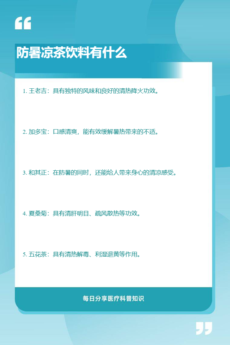 防暑凉茶饮料有王老吉、加多宝、和其正、夏桑菊、五花茶等。
