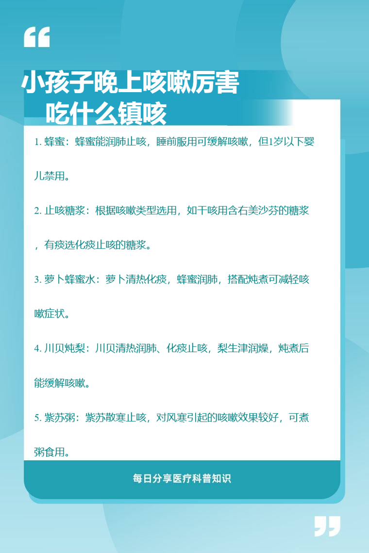 蜂蜜、止咳糖浆、萝卜蜂蜜水、川贝炖梨、紫苏粥等可在一定程度上缓解小孩子晚上咳嗽厉害的情况。