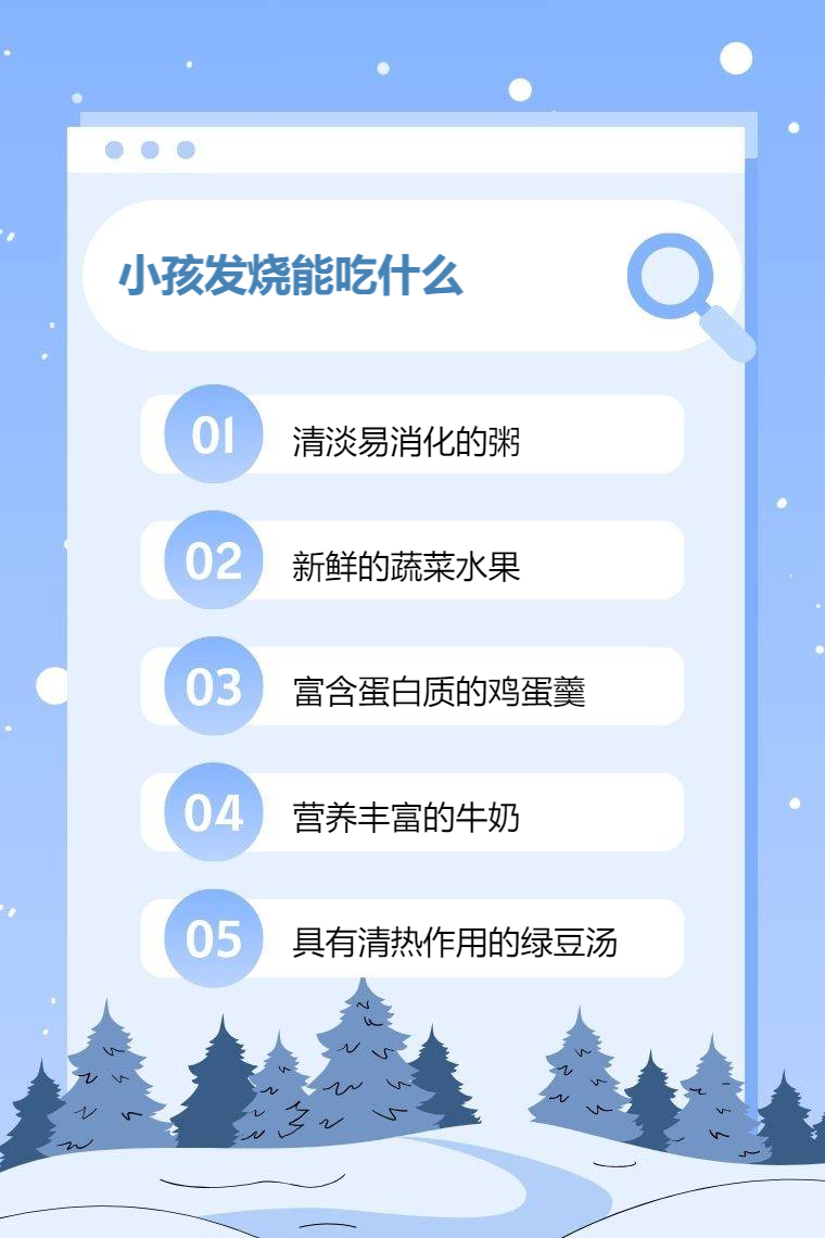 小孩发烧时可吃清淡易消化的粥、新鲜的蔬菜水果、富含蛋白质的鸡蛋羹、营养丰富的牛奶、具有清热作用的绿豆汤等。