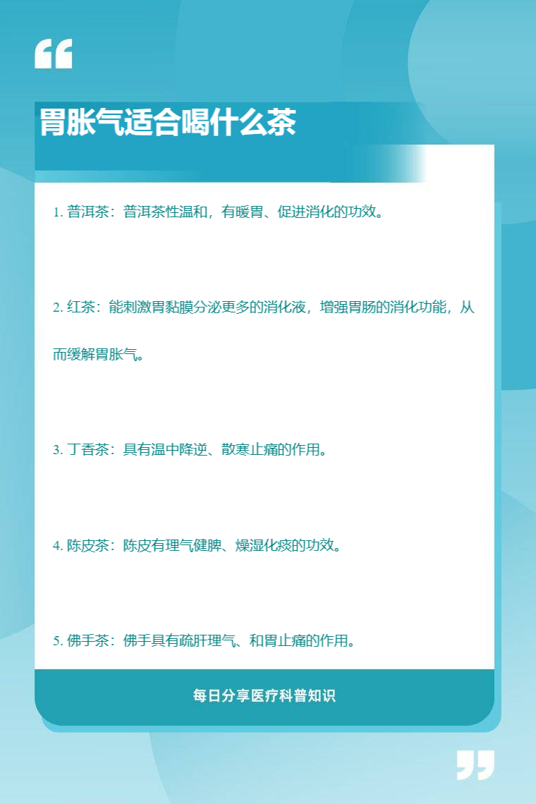 胃胀气适合喝的茶有普洱茶、红茶、丁香茶、陈皮茶、佛手茶等。