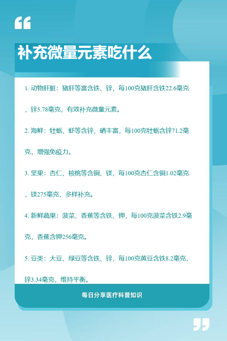 补充微量元素可通过食用动物肝脏、海鲜、坚果、新鲜蔬果、豆类等。