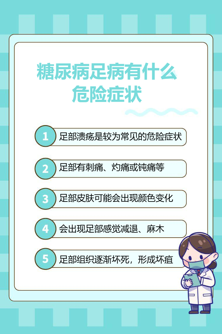 糖尿病足病的危险症状包括足部溃疡、足部疼痛、皮肤颜色改变、感觉异常、坏疽等。