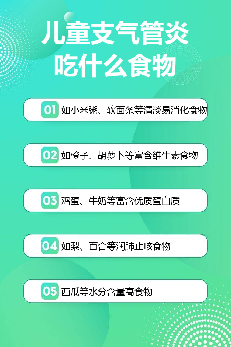 儿童支气管炎可以吃清淡易消化食物、富含维生素食物、富含蛋白质食物、润肺止咳食物、水分含量高食物等。