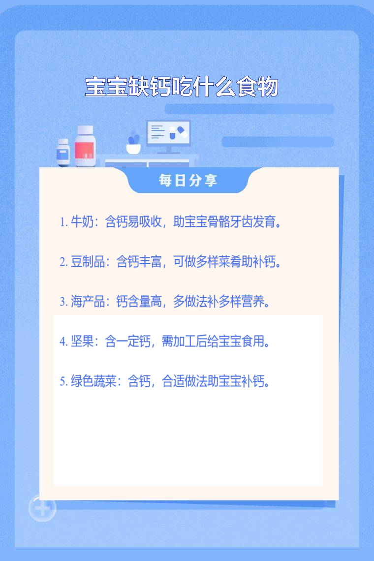 牛奶、豆制品、海产品、坚果、绿色蔬菜等都是宝宝缺钙时可选择的食物。
