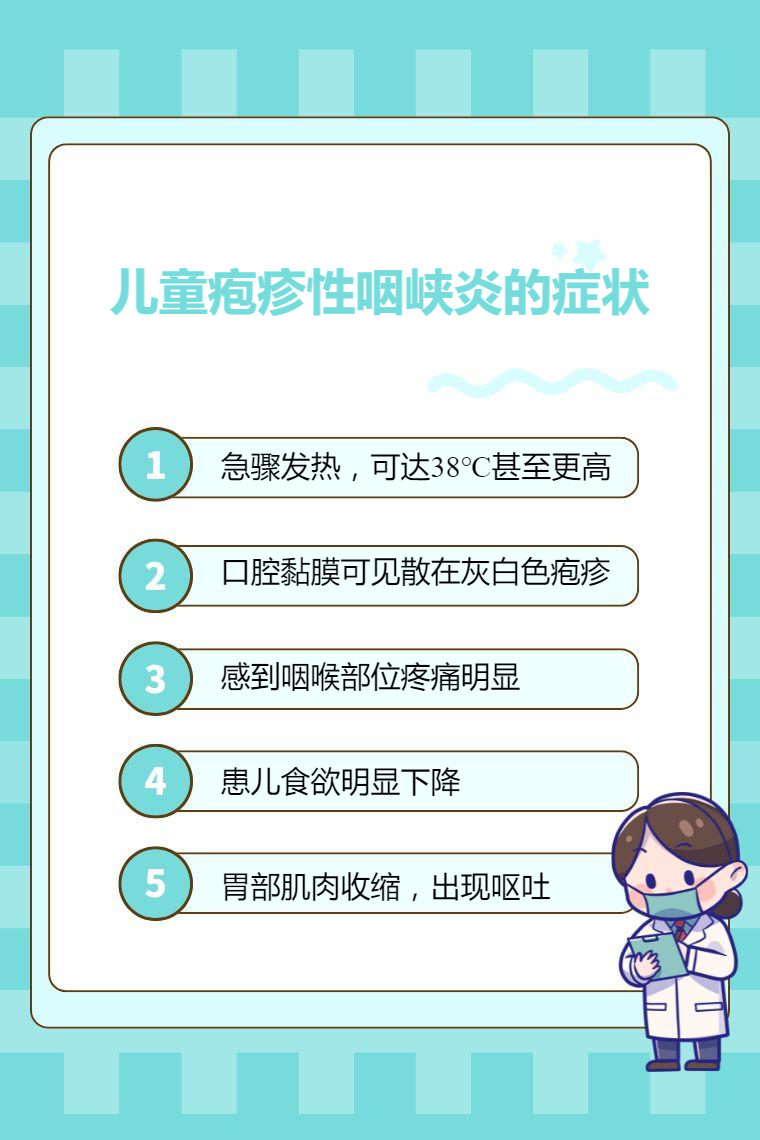 5. 呕吐:少数患儿可能出现呕吐症状,多是由于咽喉部的炎症刺激引发胃肠道的应激反应,导致胃部肌肉收缩,出现呕吐现象。