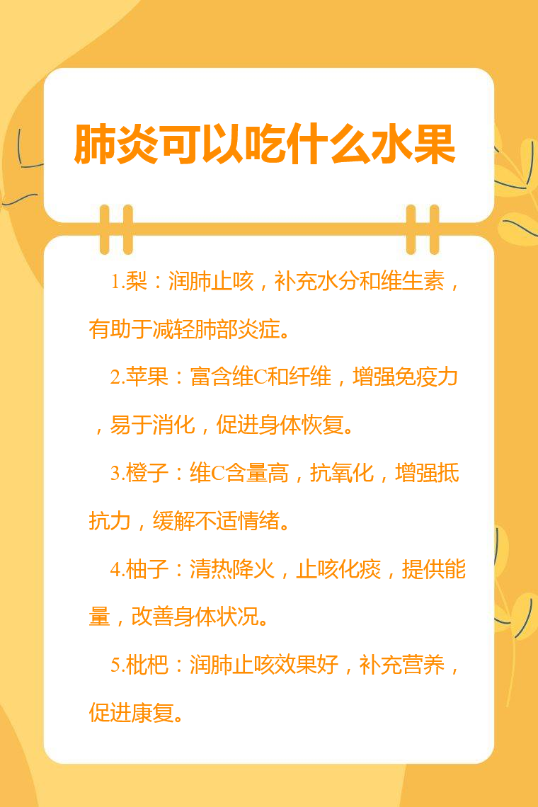 5. 枇杷:有润肺止咳、下气的功效,对肺炎导致的咳嗽症状有较好的缓解效果。枇杷富含多种营养成分,能补充身体所需营养,促进身体康复。