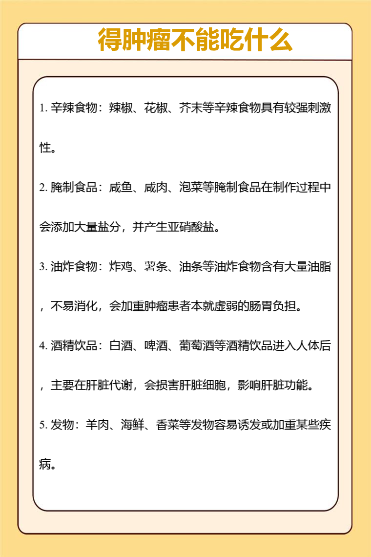 肿瘤患者不能吃辛辣食物、腌制食品、油炸食物、酒精饮品、发物等。