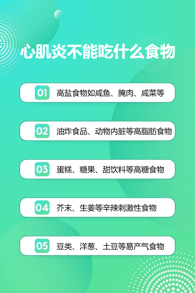 心肌炎患者不能吃高盐、高脂肪、高糖、辛辣刺激性、易产气食物等。
