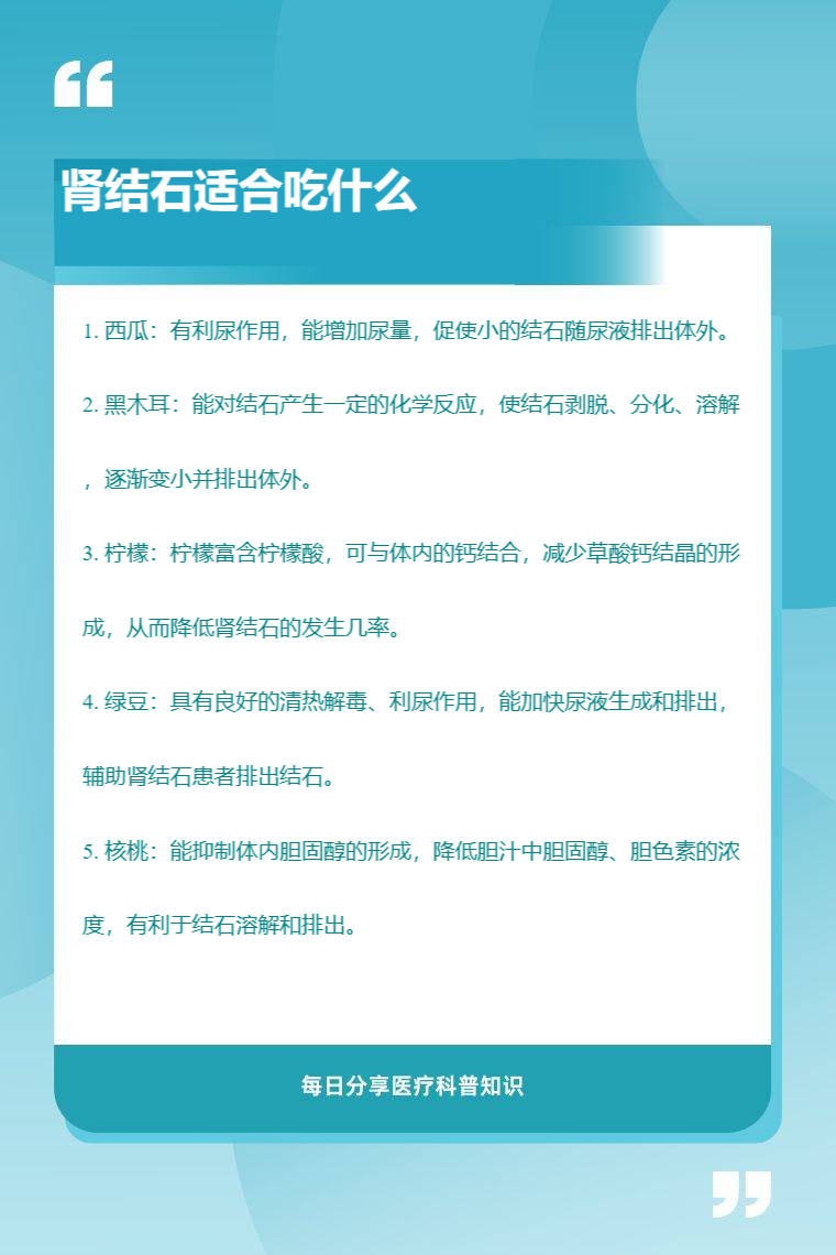 肾结石适合吃的食物有西瓜、黑木耳、柠檬、绿豆、核桃等。