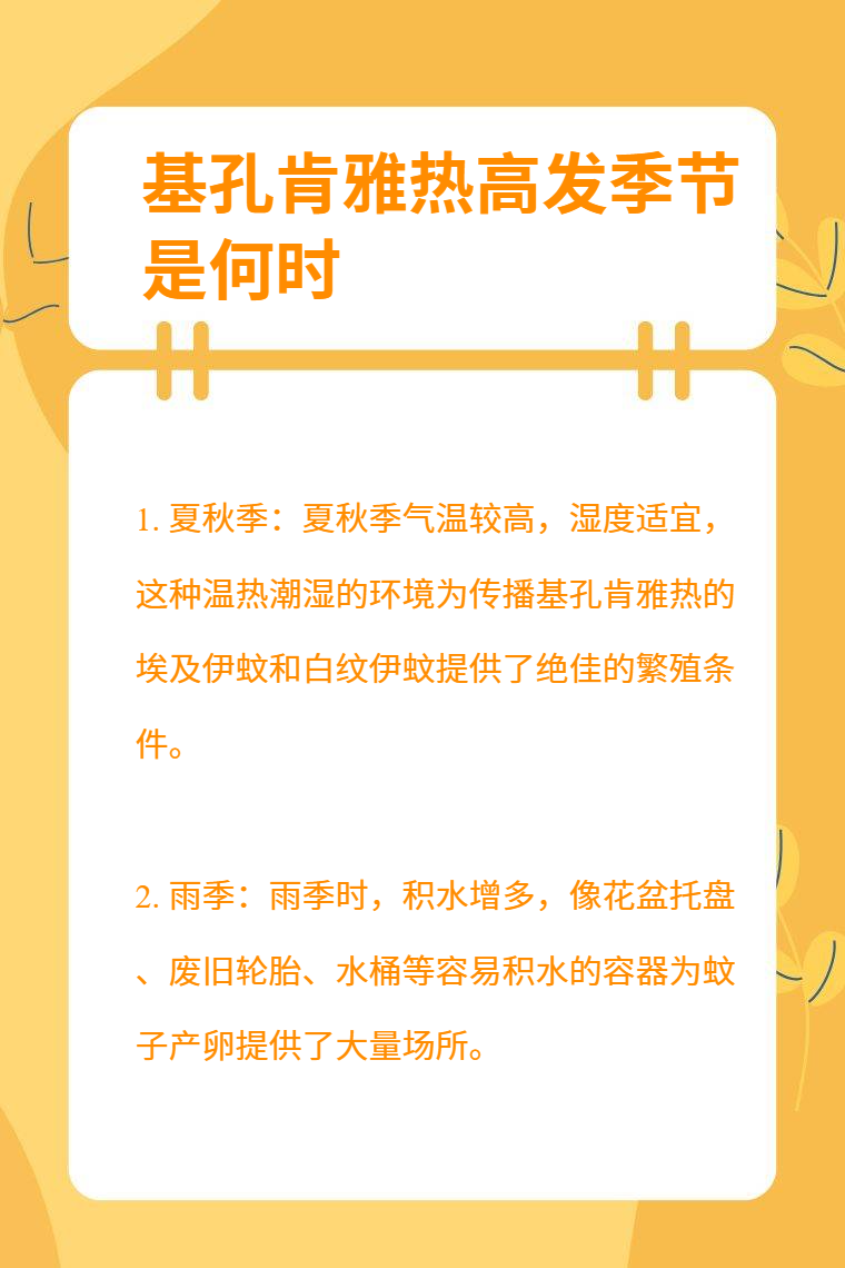 1. 夏秋季:夏秋季气温较高,湿度适宜,这种温热潮湿的环境为传播基孔肯雅热的埃及伊蚊和白纹伊蚊提供了绝佳的繁殖条件。蚊子大量滋生,活动频繁,增加了叮咬人类并传播病毒的机会,使得基孔肯雅热在这一时期更容易传播和扩散。