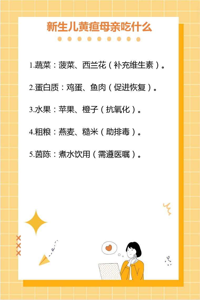 新生儿黄疸母亲可通过合理饮食辅助缓解,常见食物有清淡蔬菜、富含蛋白质食物、新鲜水果、粗粮谷物、茵陈等。