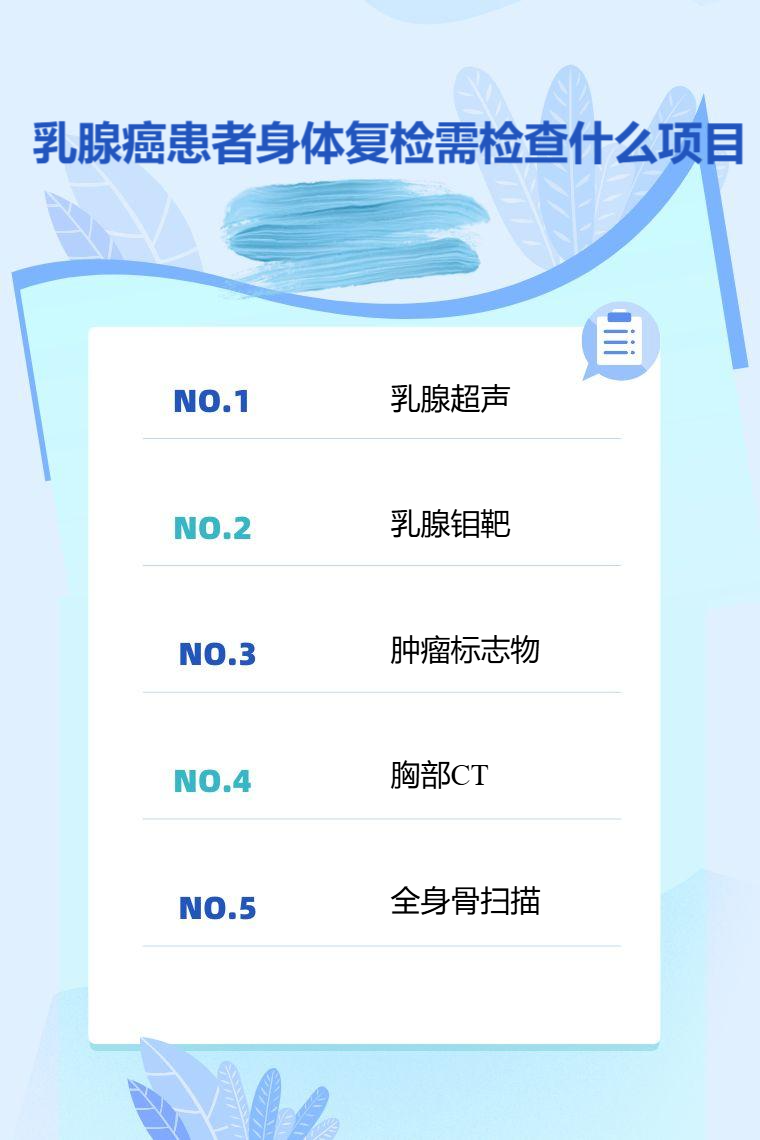 乳腺癌患者身体复检需检查乳腺超声、乳腺钼靶、肿瘤标志物、胸部CT、全身骨扫描等。