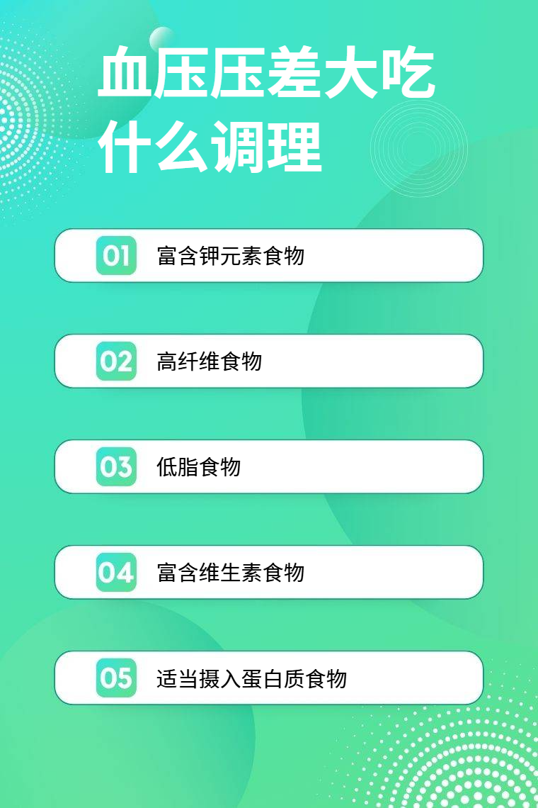 血压压差大可以通过食用富含钾元素食物、高纤维食物、低脂食物、富含维生素食物、适当摄入蛋白质食物等进行调理。