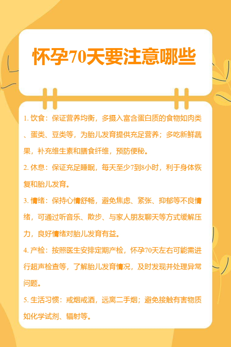 4. 产检:按照医生安排定期产检,怀孕70天左右可能需进行超声检查等,了解胎儿发育情况,及时发现并处理异常问题。
