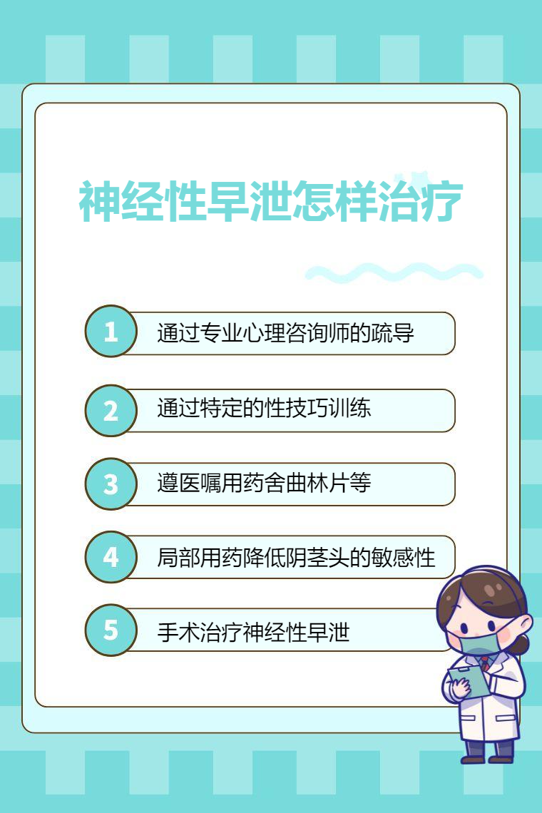 神经性早泄的治疗方法有心理治疗、行为疗法、药物治疗、局部治疗、手术治疗等。