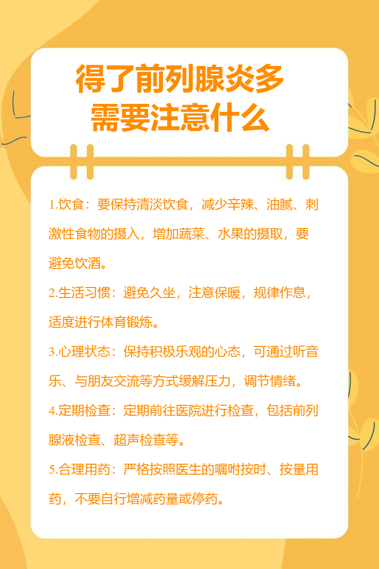 得了前列腺炎患者需要注意饮食、生活习惯、心理状态、定期检查、合理用药等。