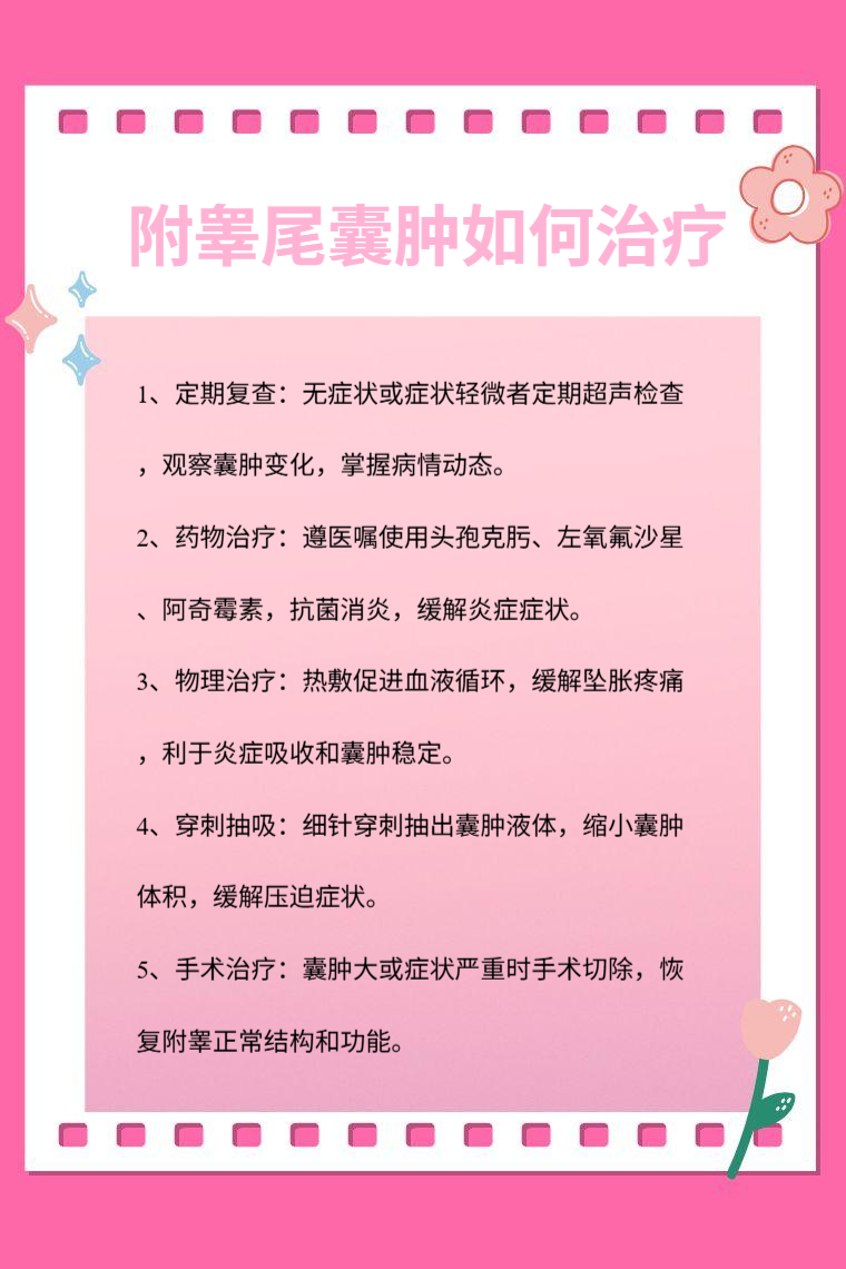 附睾尾囊肿的治疗方法有定期复查、药物治疗、物理治疗、穿刺抽吸、手术治疗等。