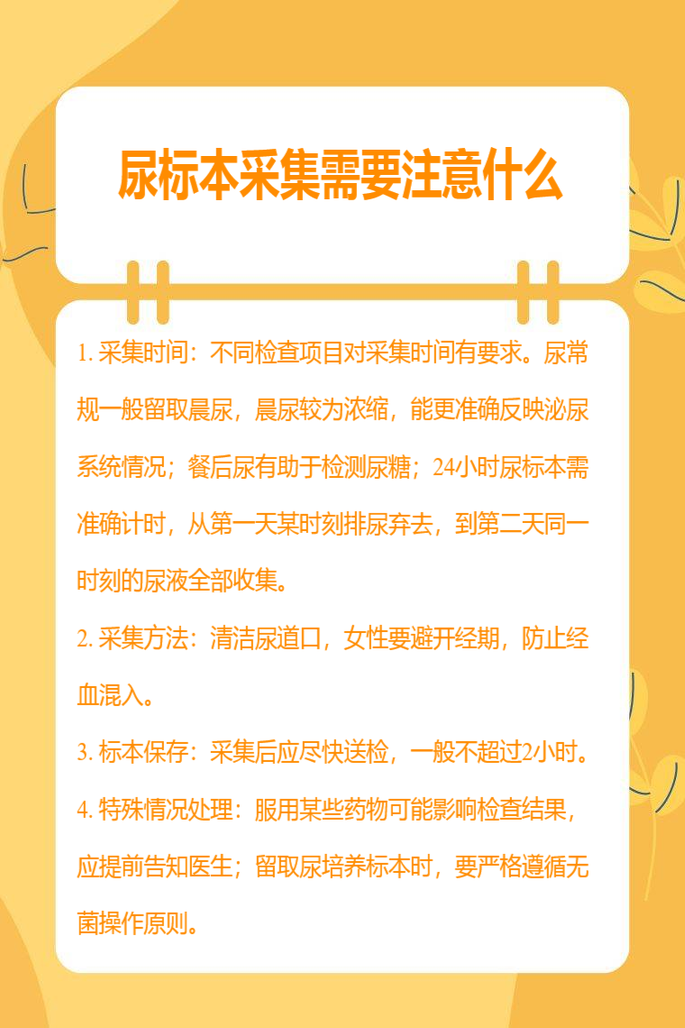 1. 采集时间:不同检查项目对采集时间有要求。尿常规一般留取晨尿,晨尿较为浓缩,能更准确反映泌尿系统情况;餐后尿有助于检测尿糖;24小时尿标本需准确计时,从第一天某时刻排尿弃去,到第二天同一时刻的尿液全部收集。
