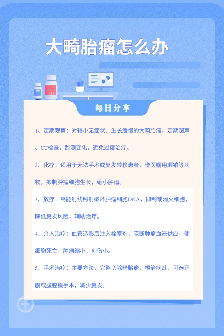 大畸胎瘤可通过定期观察、化疗、放疗、介入治疗、手术治疗等方法处理。