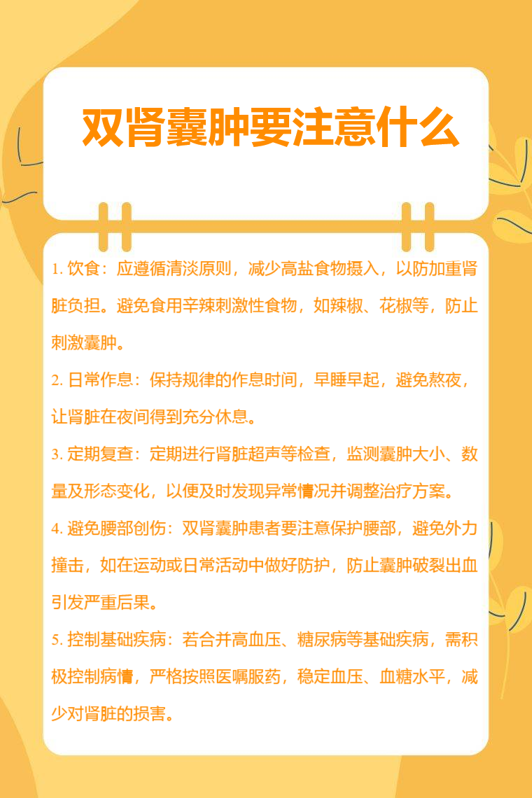 双肾囊肿患者要注意饮食、日常作息、定期复查、避免腰部创伤、控制基础疾病等。