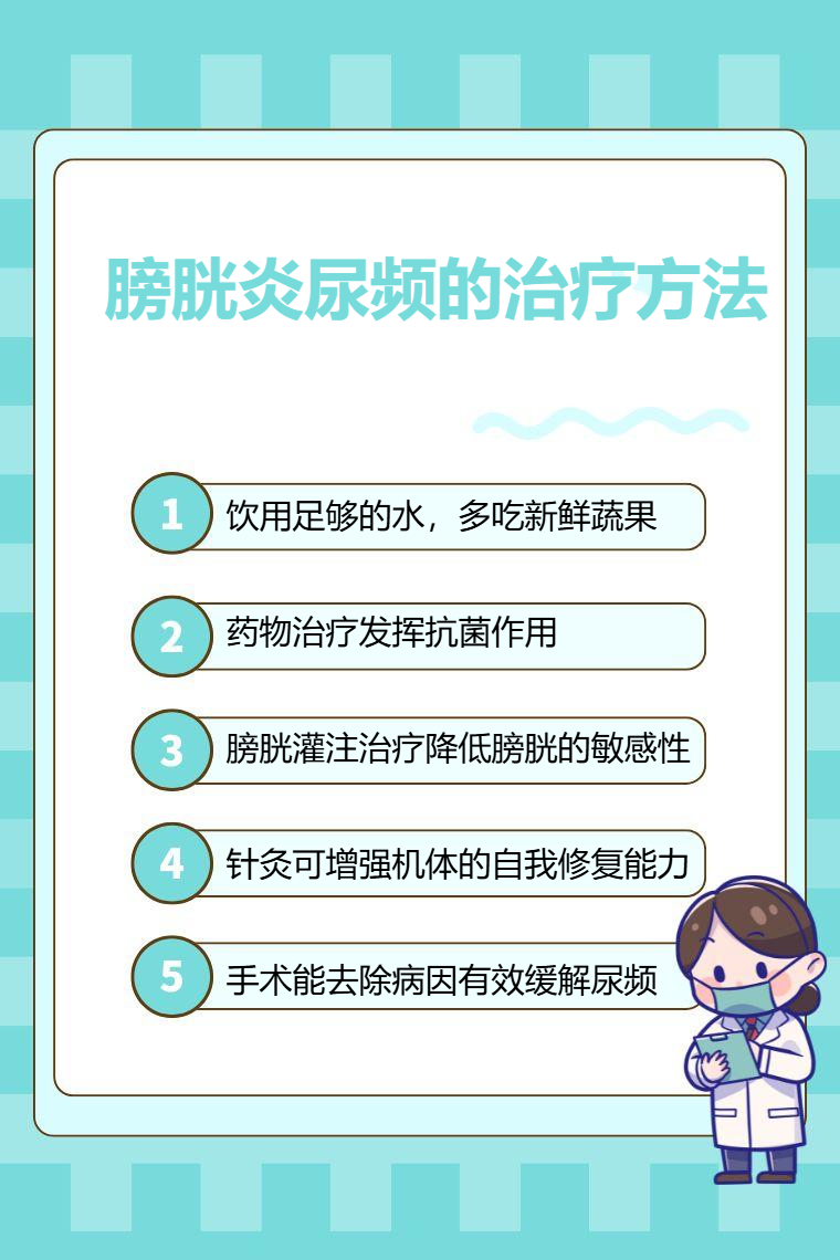 膀胱炎尿频的治疗方法包括一般治疗、药物治疗、膀胱灌注治疗、针灸治疗、手术治疗等。