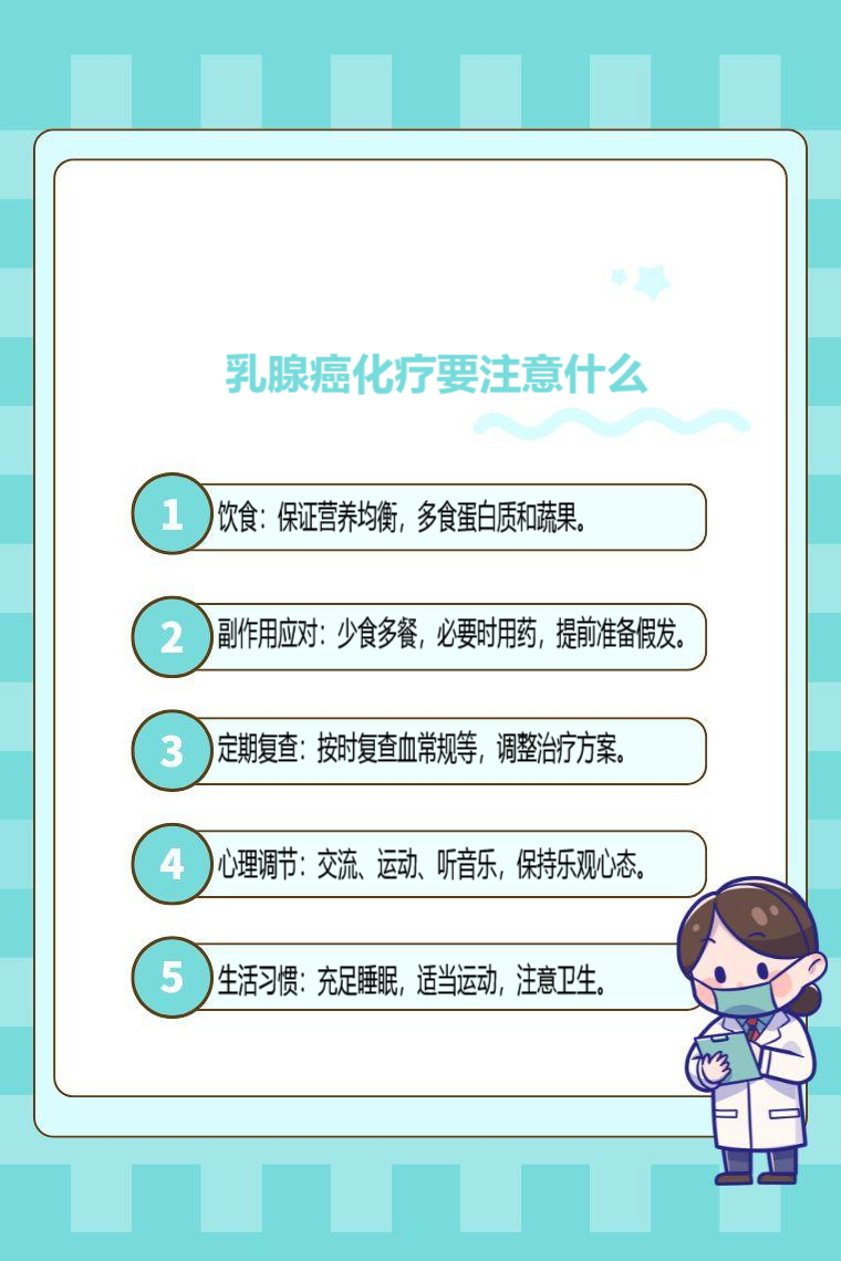 乳腺癌化疗要注意饮食、副作用应对、定期复查、心理调节、生活习惯等。