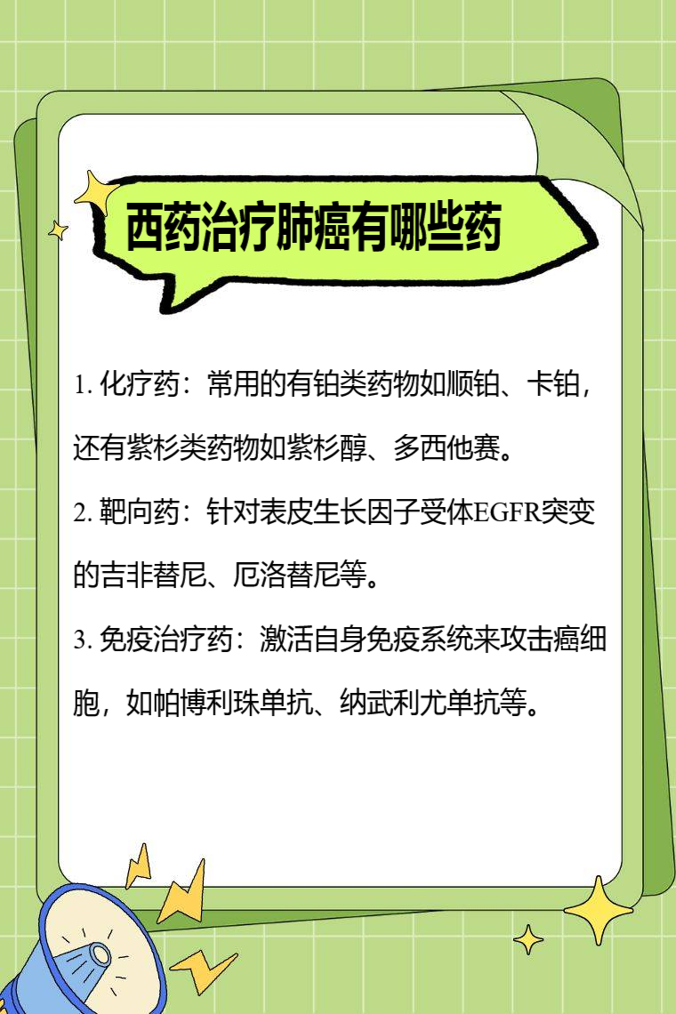 西药治疗肺癌的药物有化疗药、靶向药、免疫治疗药等。