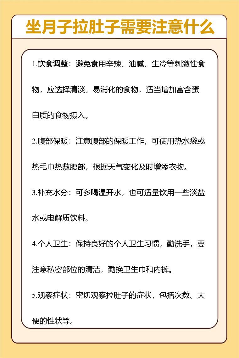 产妇坐月子期间拉肚子需注意饮食调整、腹部保暖、补充水分、个人卫生、观察症状等。