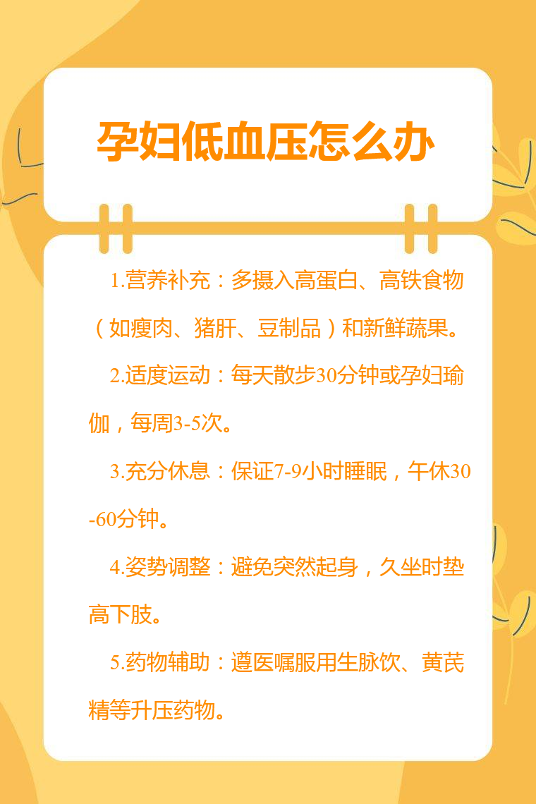 5. 药物治疗:若上述方法效果不佳,可在医生指导下用药。遵医嘱服用生脉饮口服液、黄芪精口服液、补中益气丸等药物,这些药物具有益气、升压等作用,有助于提升孕妇血压,改善低血压引起的不适症状。