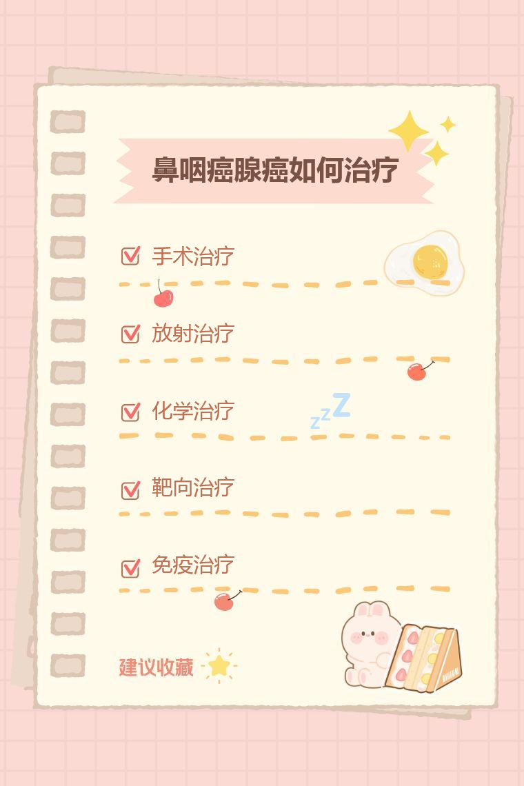 鼻咽癌腺癌的治疗方法有手术治疗、放射治疗、化学治疗、靶向治疗、免疫治疗等。