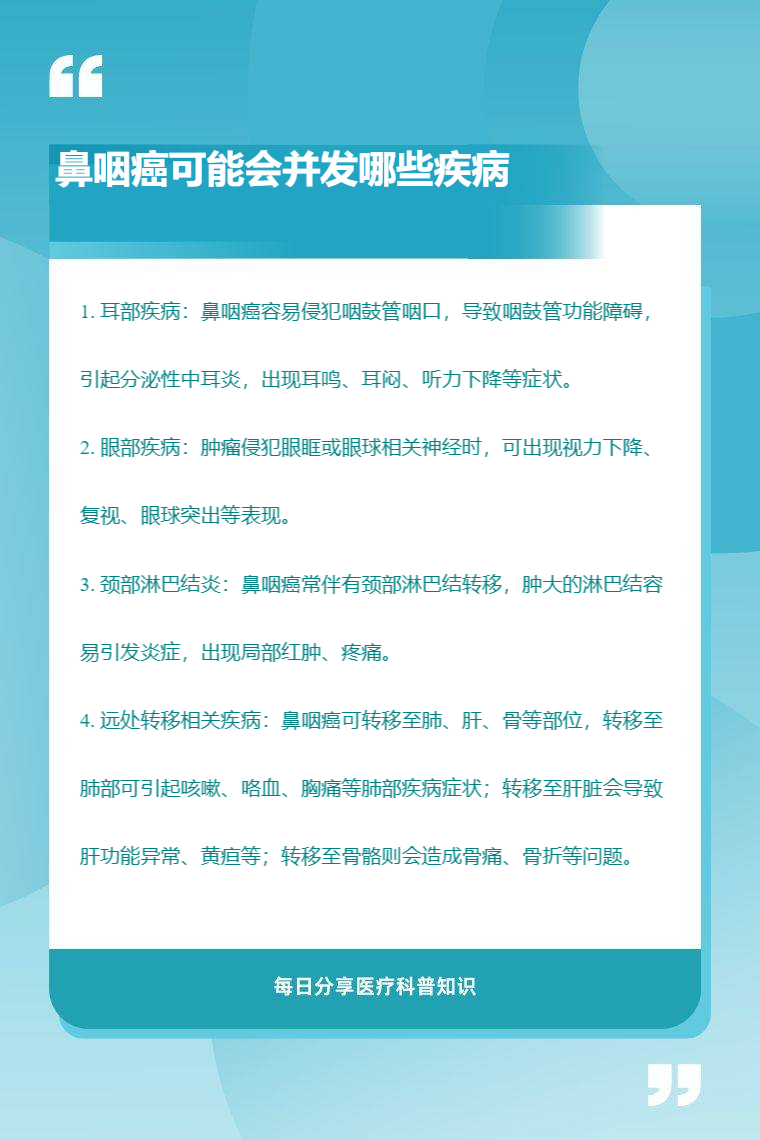 鼻咽癌可能会并发耳部疾病、眼部疾病、颈部淋巴结炎、远处转移相关疾病等。
