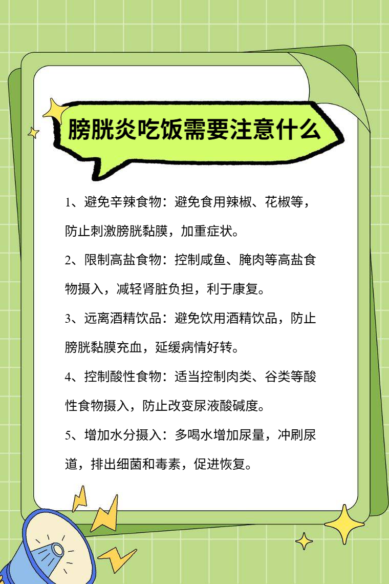 膀胱炎患者吃饭需注意避免辛辣食物、限制高盐食物、远离酒精饮品、控制酸性食物、增加水分摄入等。