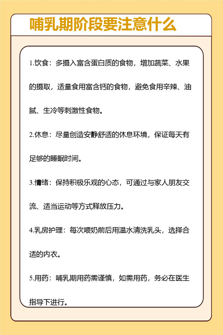 哺乳期阶段女性要注意饮食、休息、情绪、乳房护理、用药等。