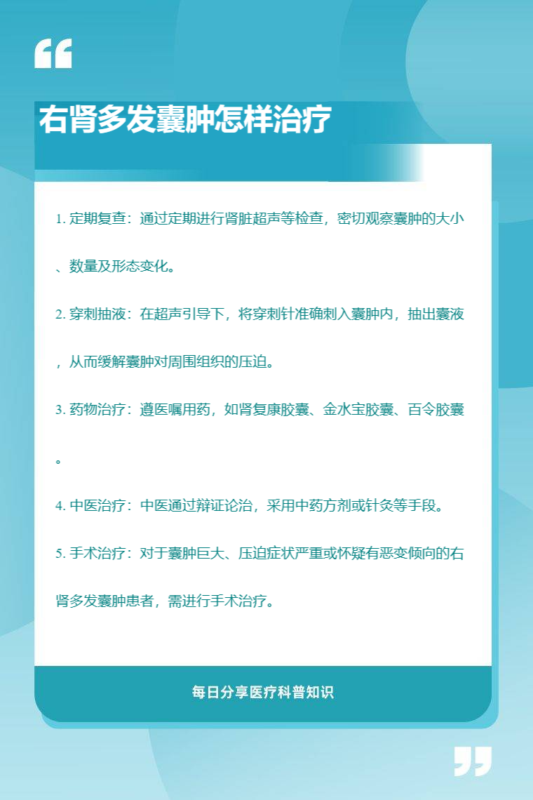 右肾多发囊肿的治疗方法有定期复查、穿刺抽液、药物治疗、中医治疗、手术治疗等。