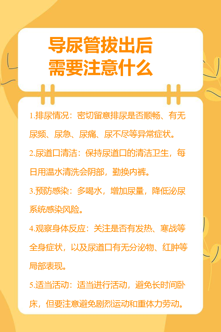 导尿管拔出后患者需要注意排尿情况、尿道口清洁、预防感染、观察身体反应、适当活动等。