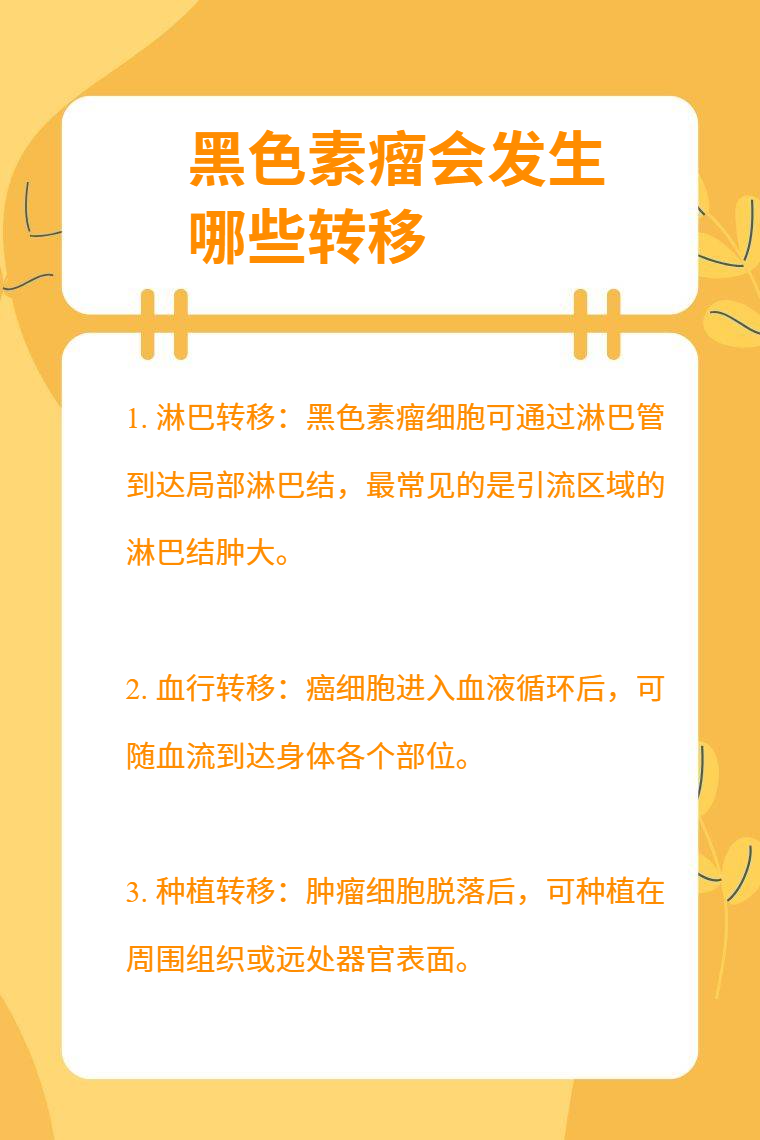 黑色素瘤会发生淋巴转移、血行转移、种植转移等。