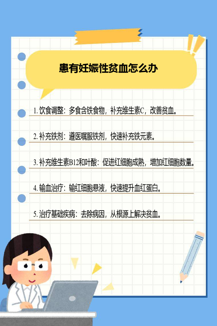 患有妊娠性贫血可通过饮食调整、补充铁剂、补充维生素B12和叶酸、输血治疗、治疗基础疾病等方法来应对。